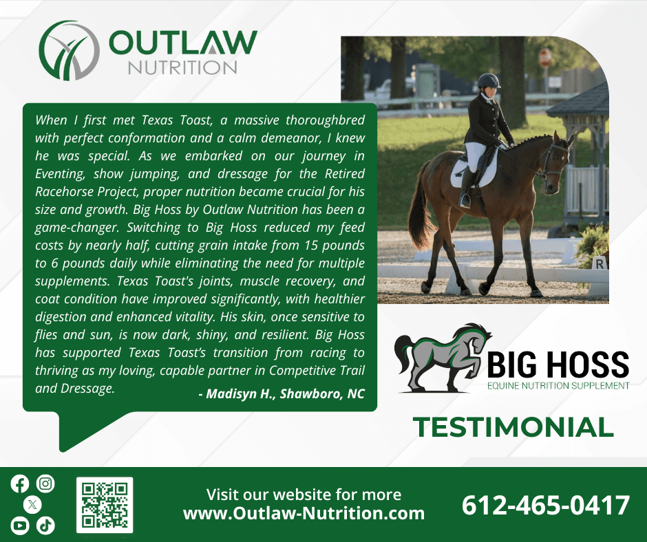 Discover real Outlaw Nutrition reviews from satisfied customers across the USA. Our all-natural supplements – including Big Hoss, Stocked Up, Unleashed, Cold Milled Flax, and Hemp Seed Protein – have helped transform the health of horses, livestock, dogs, sheep, goats, alpacas, and more.
